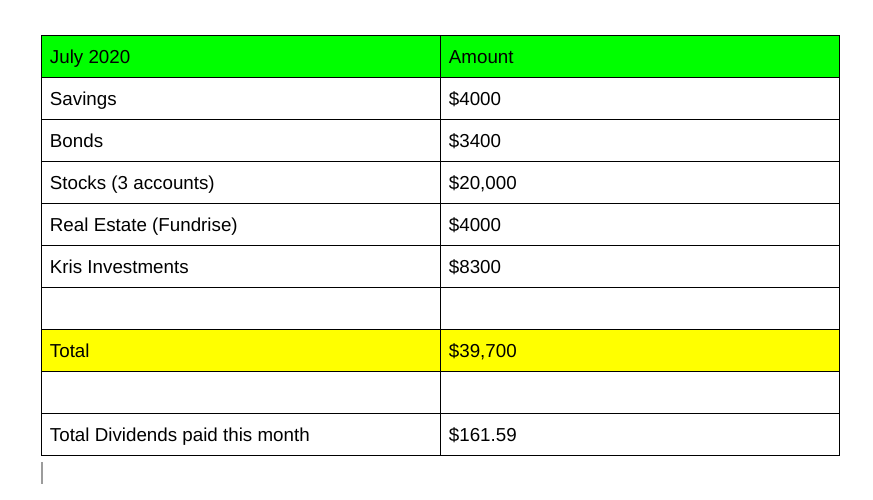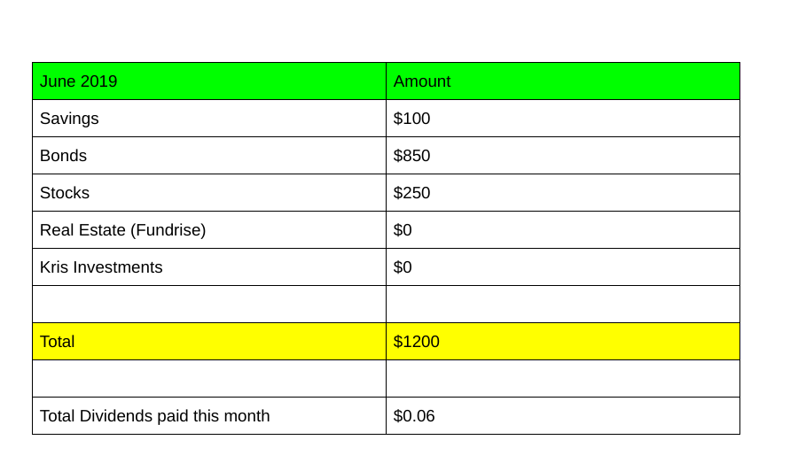 Now, let’s get to the meat of our investments. First, remember the 4 parts of a balanced portfolio Savings, Bonds, Stocks, and Real Estate. Let’s take a look when Kris and I first starting in June 2019.