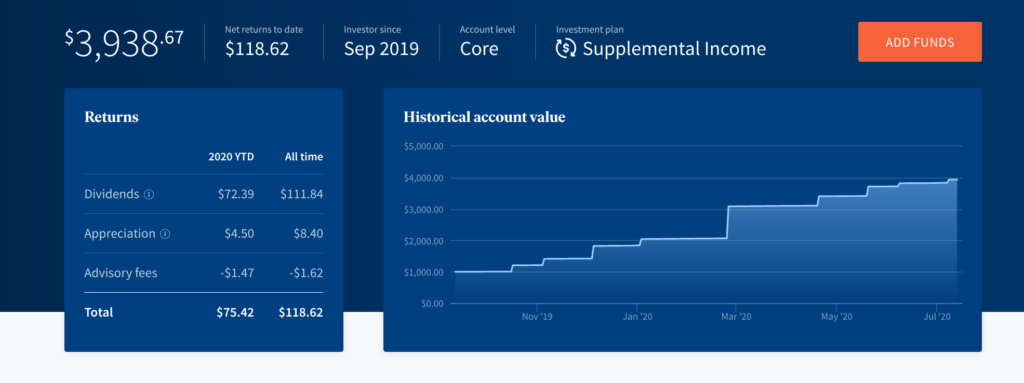 I choose the supplemental income portfolio, which is geared towards dividends. They pay dividends quarterly. During the March 2020 downturn, they did not pay out as much in dividends, to ensure they had proper liquidity during the crisis. That is fine with me because my principal investments did not decrease, unlike in the stock market.