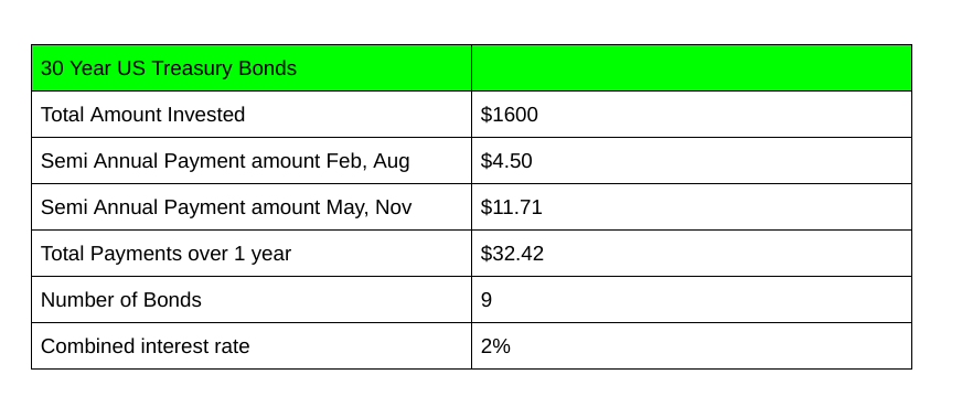 30-year bonds are my favorite way to invest in bonds. Eventually, over 10 years, I would like to get each quarterly payment up to $200.