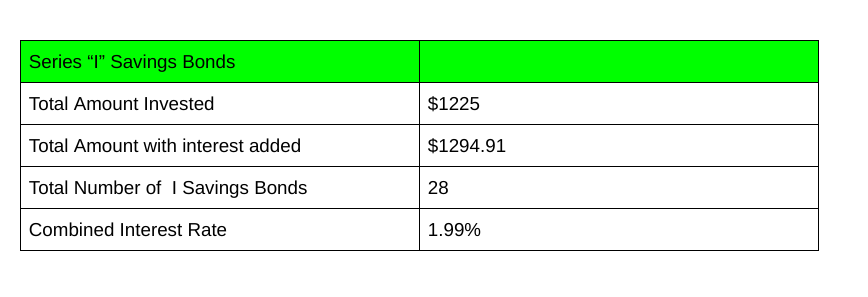 I like “I” savings bonds because they are like mini savings accounts. They accumulate interest and their value rises over time. However, they are easy to liquid in a pinch. If I had to sell any assets, these would be the first to go.