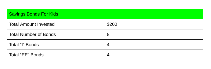 Currently, I buy each child one “I” bond and one “EE” bond monthly. The face value is $25 each. It will be a good way to start their own portfolios off the correct way.