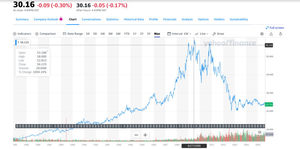 Value Investing: Sometimes called Dividend Growth Investing. Here you pick a solid company and let their profits pay off in the form of dividend payments. If had bought one share of AT&T (T) on the day I went to boot camp, it would have cost me $56. Today it is worth $30. However, overall the years T would have paid that one stock $33 worth of dividends. T is still in great shape and hopefully, I would still be collecting more dividends for the foreseeable future. For retirement under value investing, you would live off of the dividends, you would not sell the actual shares.