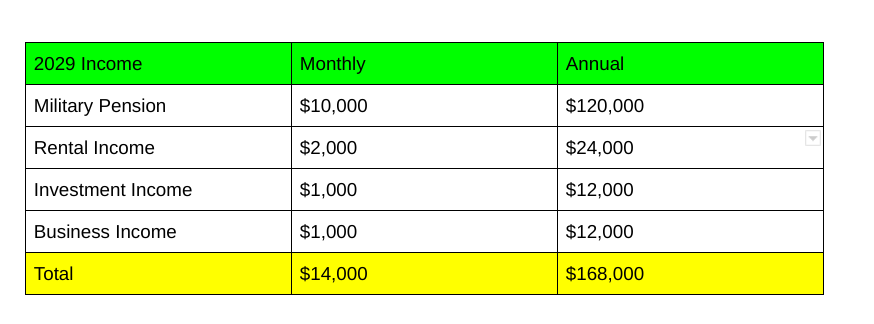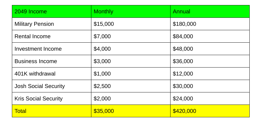 As of today, this is our initial retirement plan. I say initial because this is just the plan for when I retire from the military in 2029 at age 48. I still plan on working for at least another 10-15 years. Heck, may as well make double-dip in the civilian workforce. Let’s take a look at 2029 and then we will fast forward to our plan for 2049.