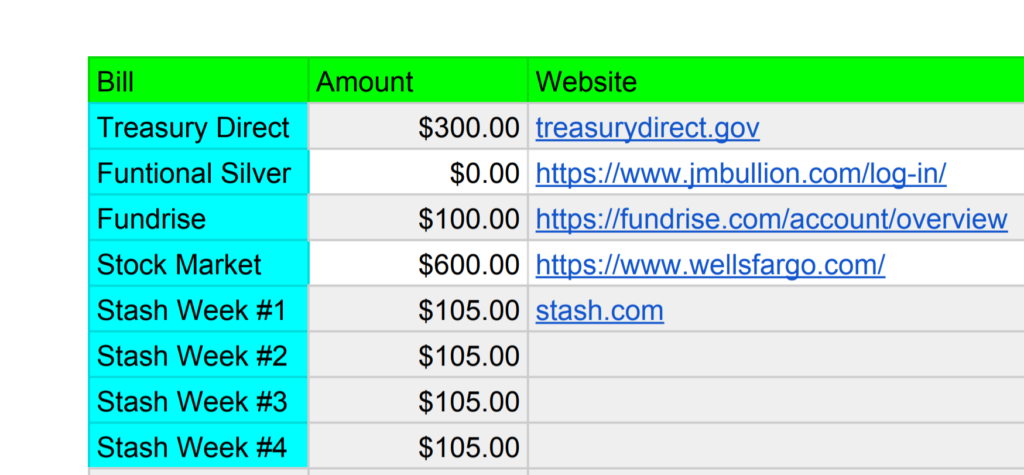 • Silver: I usually invest $160 in silver per month, however, the prices are extremely high right now. I will pause this until the price is more reasonable.