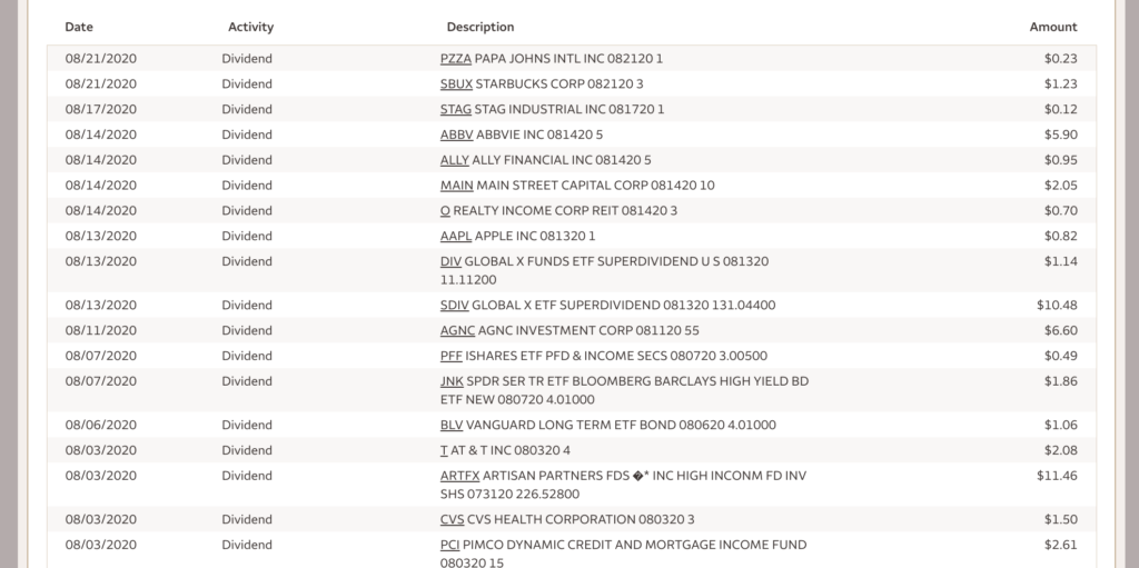 I first learned about dividends in June of 2019. I was so fascinated by the idea of being paid while chilling on the beach that I immediately committed to building a dividend portfolio. I received my first 2 dividends in August and September of 2019. First was Papa John’s for $0.23 and the other was Intel for $0.95. I was so proud of myself for earning those dividends. A year later, we are routinely earning $160 a month from dividends and interests.