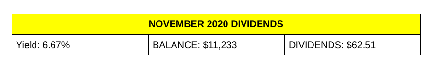 Let’s see what dividends we were paid in November 2020. My goal is to get to $1 Million which would yield roughly $40,000 a year of dividend income.