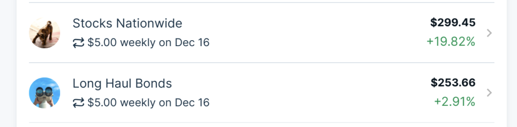 The bond funds I use are Vanguard Long term Bonds (BLV, 3.3%), High Yield Bonds (JNK, 5.07%), and iShares 20+ year Bonds (TLT, 1.62%). Look at the picture below. The top stock, Stock Nationwide, is VTI. And the bottom stock, Long Haul Bonds, is BLV. Right now stocks are on fire!! So VTI is far outpacing BLV. In fact, I have exactly $249 invested in both. However, if something crazy happened in the world (like a pandemic), people would try to sell their positions in VTI at a profit and put them into a safer investment in bonds. That is why bonds go up when stocks go down. So it is good to keep both on hand.