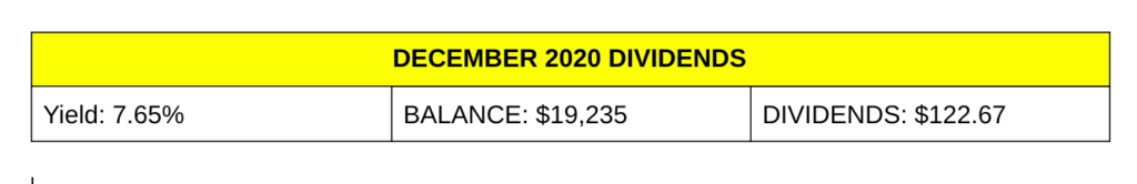 Let’s see what dividends we were paid in December 2020. My goal is to get to $1 Million which would yield roughly $40,000 a year of dividend income.