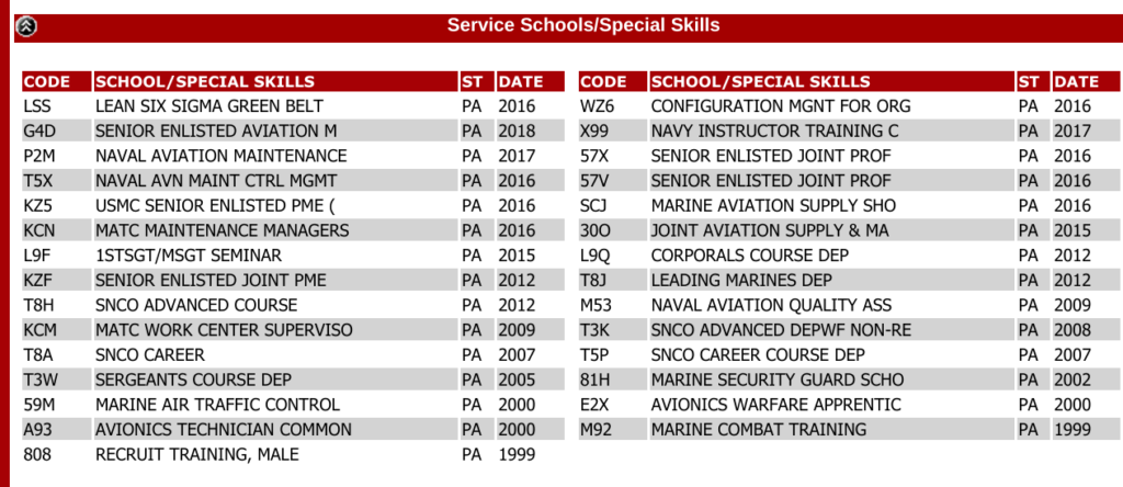 I will break down the education types into four categories: Military Occupational Speciality (MOS) Training/Related, Professional Military Education, related civilian job training, and higher education.
