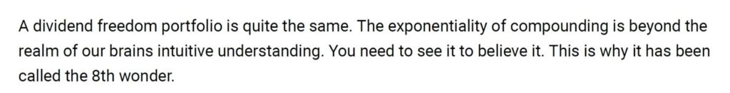 “The exponentiality of compounding is beyond the realm of our brains intuitive understanding. You will see it to believe it. This is why it has been called the 8th wonder.”