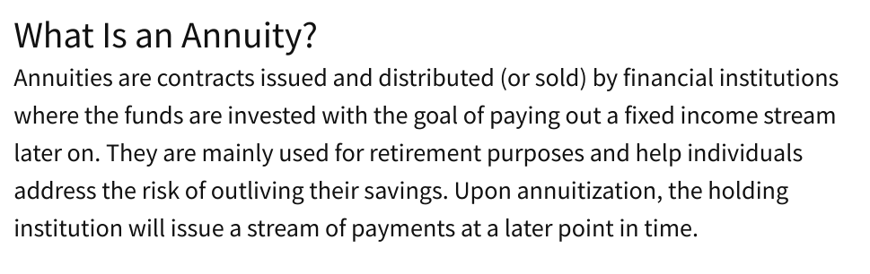 An annuity is an insurance contract issued to create a consistent monthly payment to the holder for the rest of their life. You can read a more detailed analysis of annuities here at Investopedia.