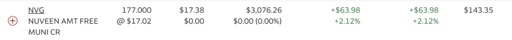 I currently have roughly $3,100 in my allotment of NVG, which pays me $12 every first of the month. I do not have dividend reinvestment turned on for NVG because I reinvest into other securities on a discount.