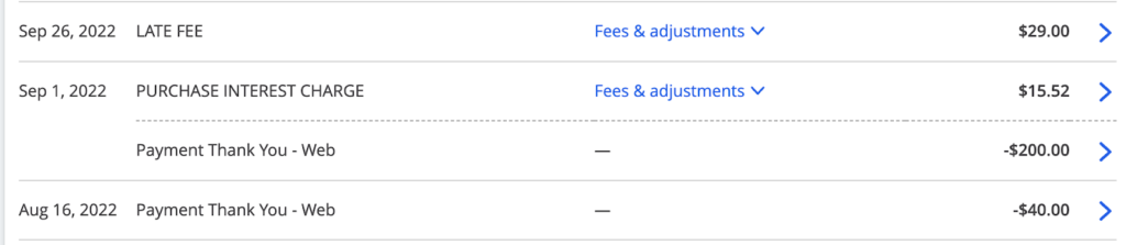 When I went to pay my bill in October, I saw a nice, fat late fee. It turns out my billing cycle started on September 2nd. Although I had made a payment five times the minimum on September 1st, it didn’t qualify for a September payment.