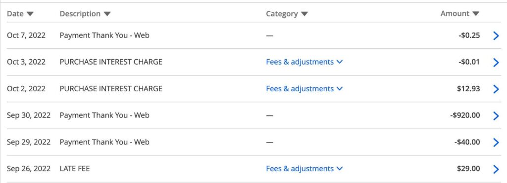 The second incident. After my surprising late fee, I wanted to pay this card off immediately. I believe I owed about $912 at the time, so I made a payment for $920 on September 30th.