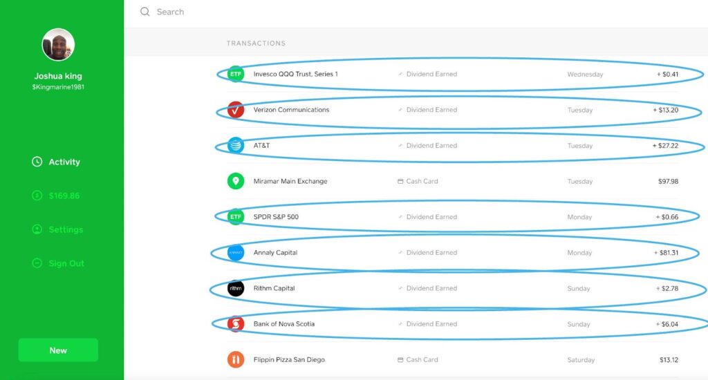 The screenshot above is from my Dividend Debit Card (Cash App). You can see all the various dividends I received over a week.