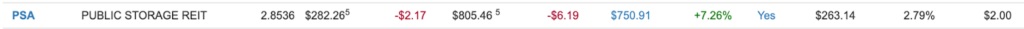 I own 2.8 shares of PSA common stock at $263/share. The current price is $282, which gives me a 7% unrealized gain. I am getting around a 3% dividend yield on cost.