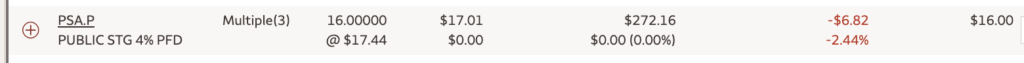 I also own 16 shares of Public Storage Preferred Shares P (PSA.P). It yields 4%; however, I didn’t buy them at the par value of $25. As you can see, my average price is $17.44, giving me a yield on cost of 5.7%.