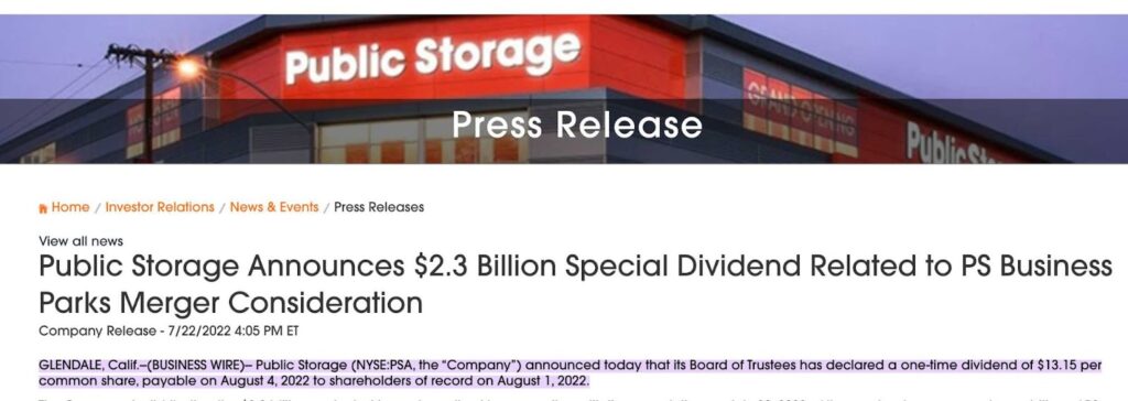 There is nothing like being surprised—this is what you get with common stocks. For example, PSA paid a one-time $13.15 per share special dividend in August 2022. That is over six times the standard $2.00/share quarterly dividend.