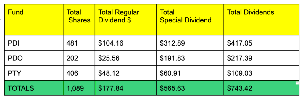 Across these three securities, I received an average of $0.58 per share. Since I have many shares of these beloved stocks, I had a huge payday.