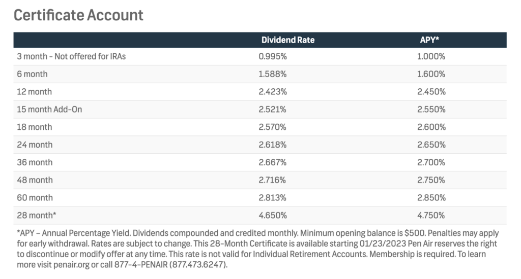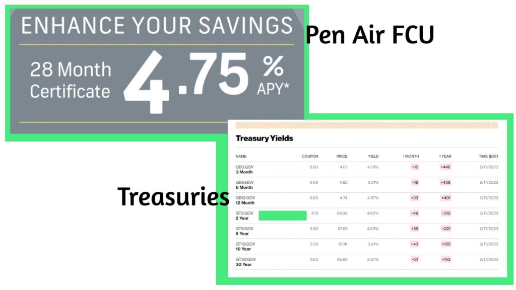 As you can see above, Pen Air Federal Credit Union is paying 4.75% for 28 months, and the 2-Year Treasury Note pays 4.13%.