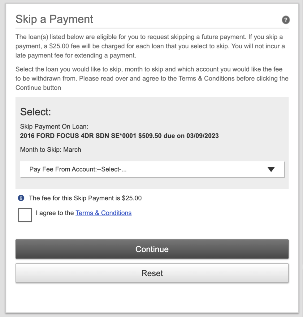 I logged in to pay my monthly car payment and received a strange notification. I could now skip my car payment for a $25 fee.