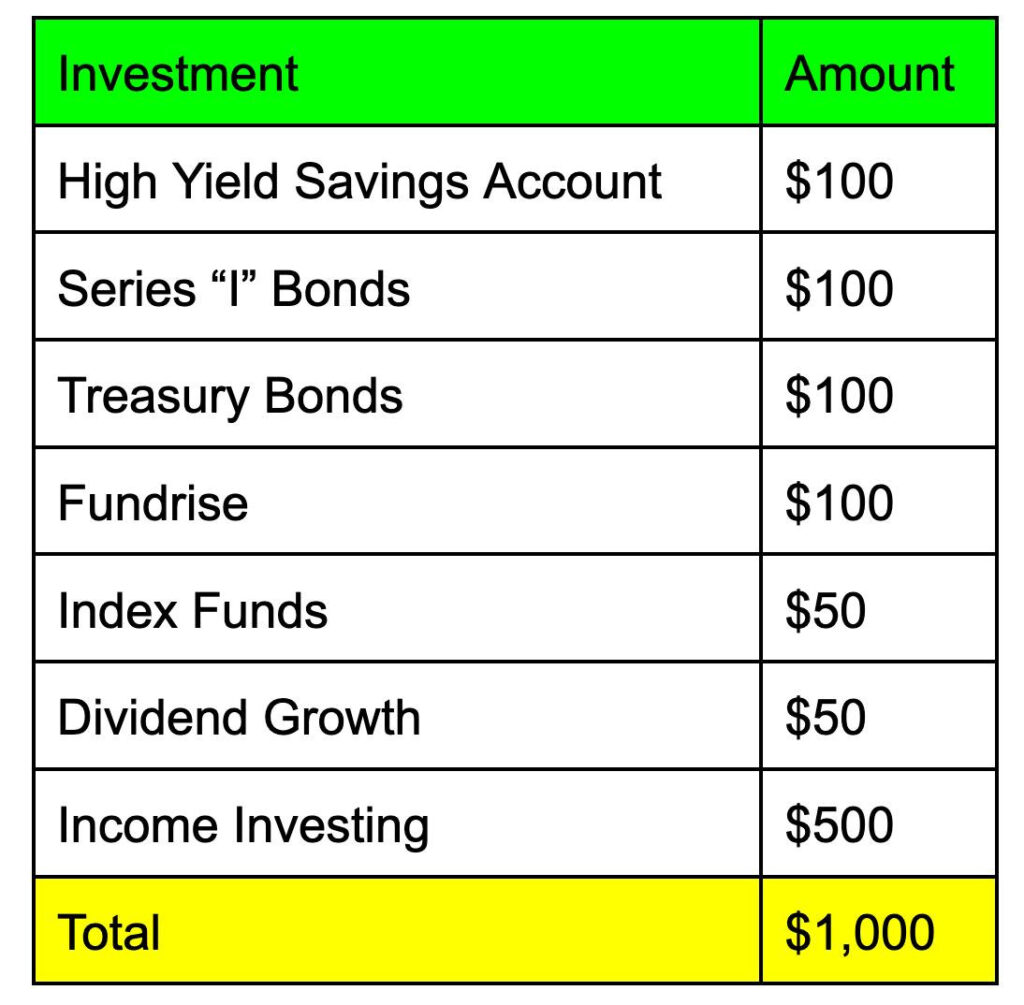 Putting it all together. How would I invest $1,000 per month? As I said earlier, everyone is different, and we must invest as such. Here’s how I would allocate my resources.