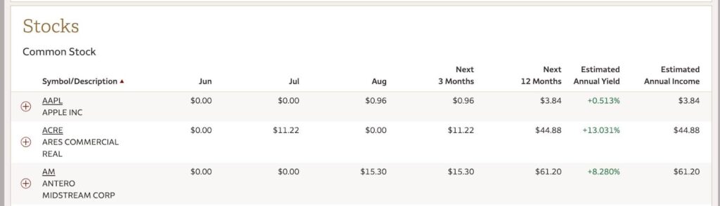 Income calendar. Wells Fargo has the best income calendar of my five brokerages by far. It tells me what money I have coming in and from what stock, down to the penny.