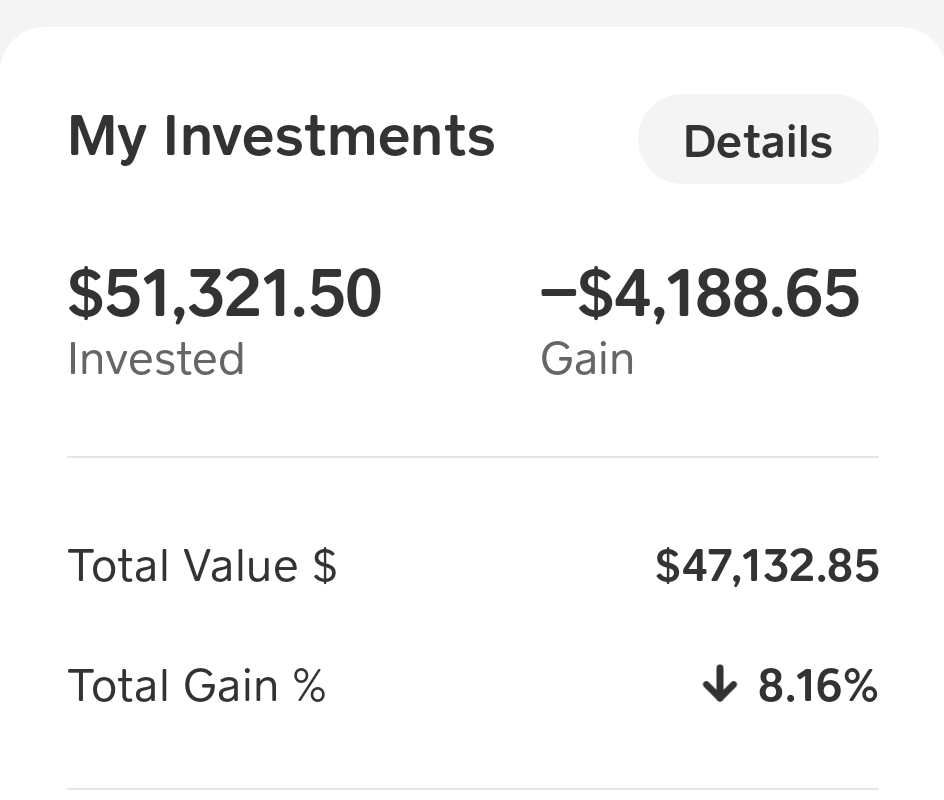 I had $51,000 invested in my Cash App last month, with a current balance of $47,137. I started investing in my Cash App in July 2020.