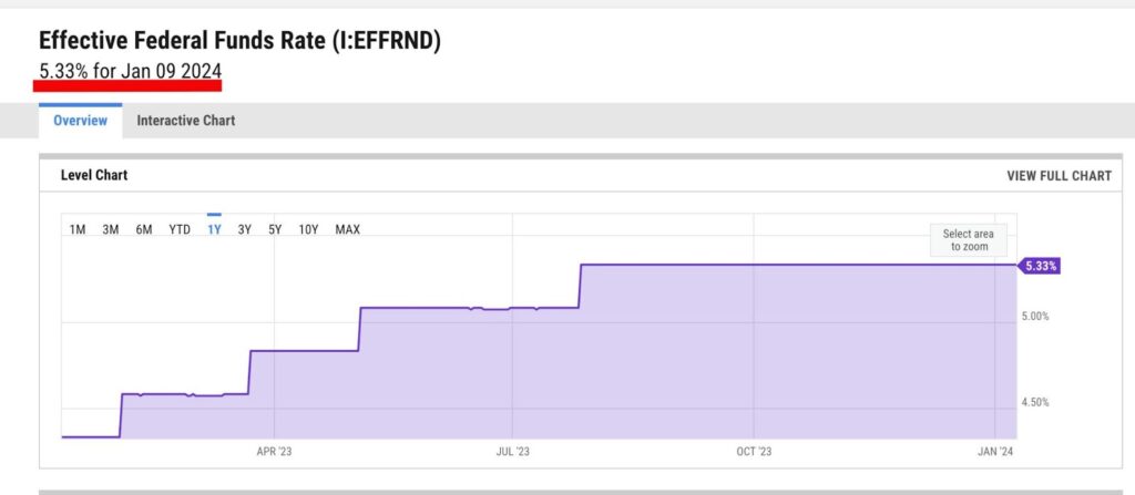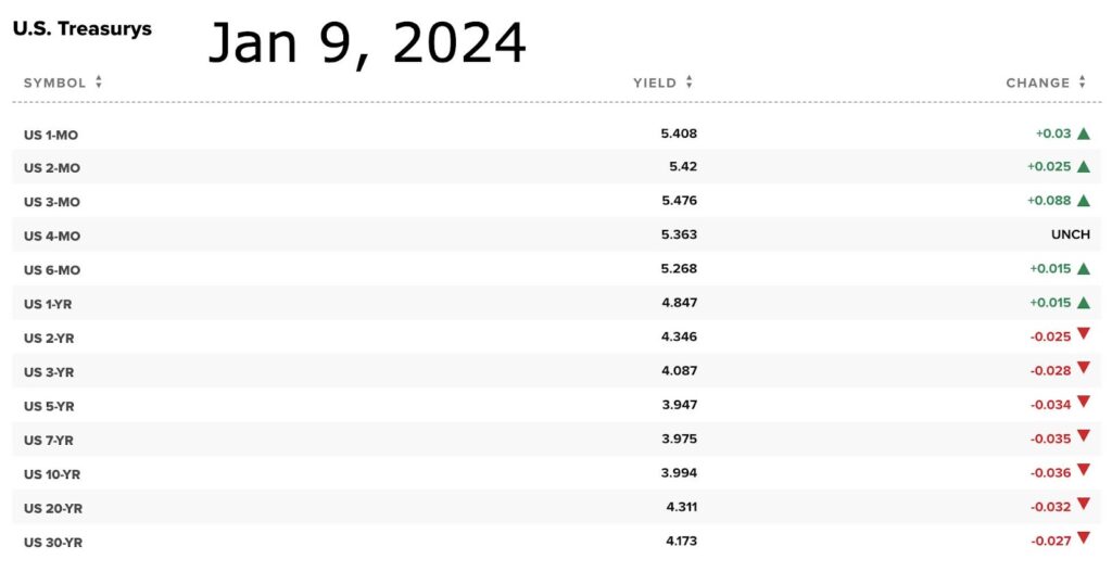 Let’s look at Treasury rates today based on a Federal Funds Rate of 5.33%. As you can see, the various US Treasuries adjust to today’s FFR versus future expectations.