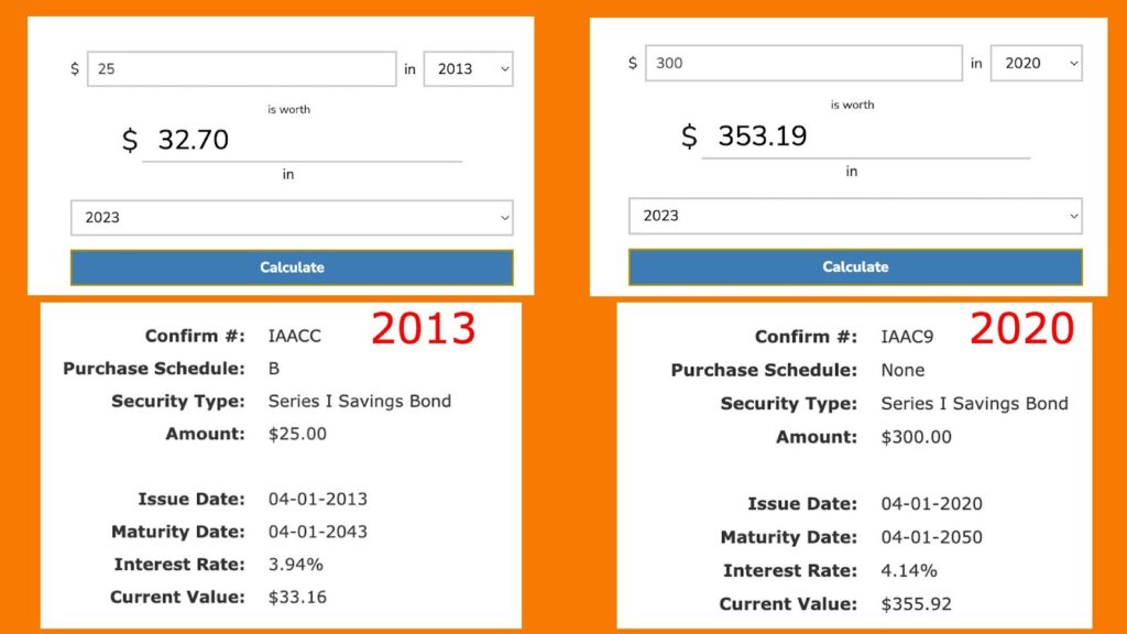 I bought a $300 Series “I” Bonds that month. The inflation calculator says that my $300 should be worth $353.19. My bond is worth $355.92. This is amazing!