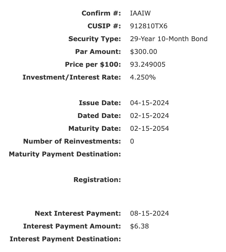 First, let’s take a look at the most recent 30-year Bond I purchased from Treasurydirect. I bought a $300 bond for $281. The coupon is 4.25%. My effective yield is roughly 4.7%.